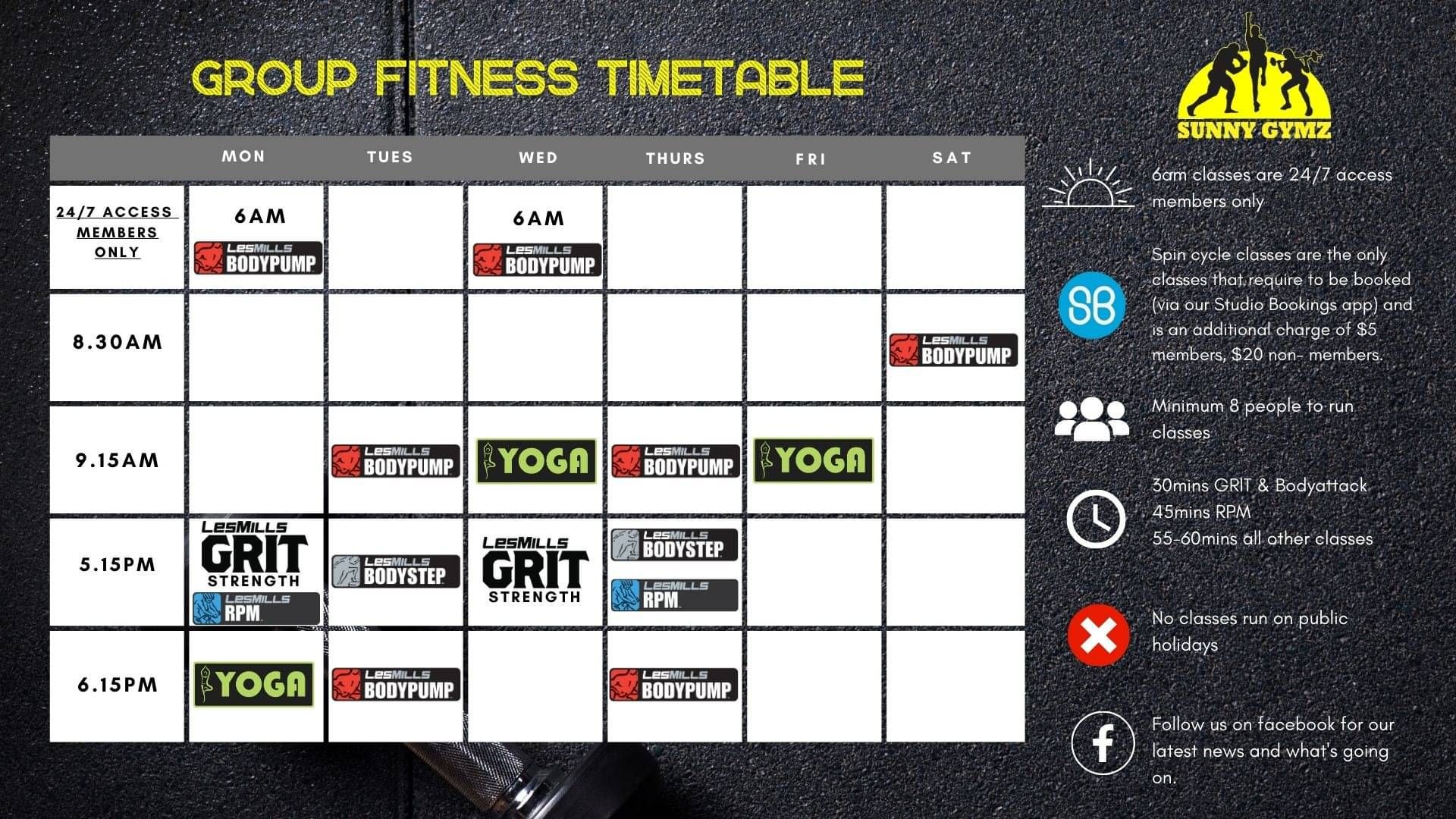 Check the timetable below and click the "Book Now" button next to the class you want to attend. You'll be taken to the Sunny Gymz Studio Bookings page. Register your details and you'll be able to book and pay for your class right away.